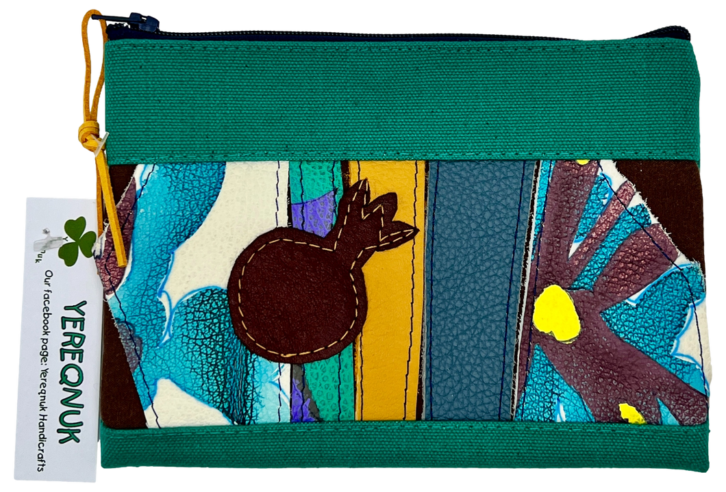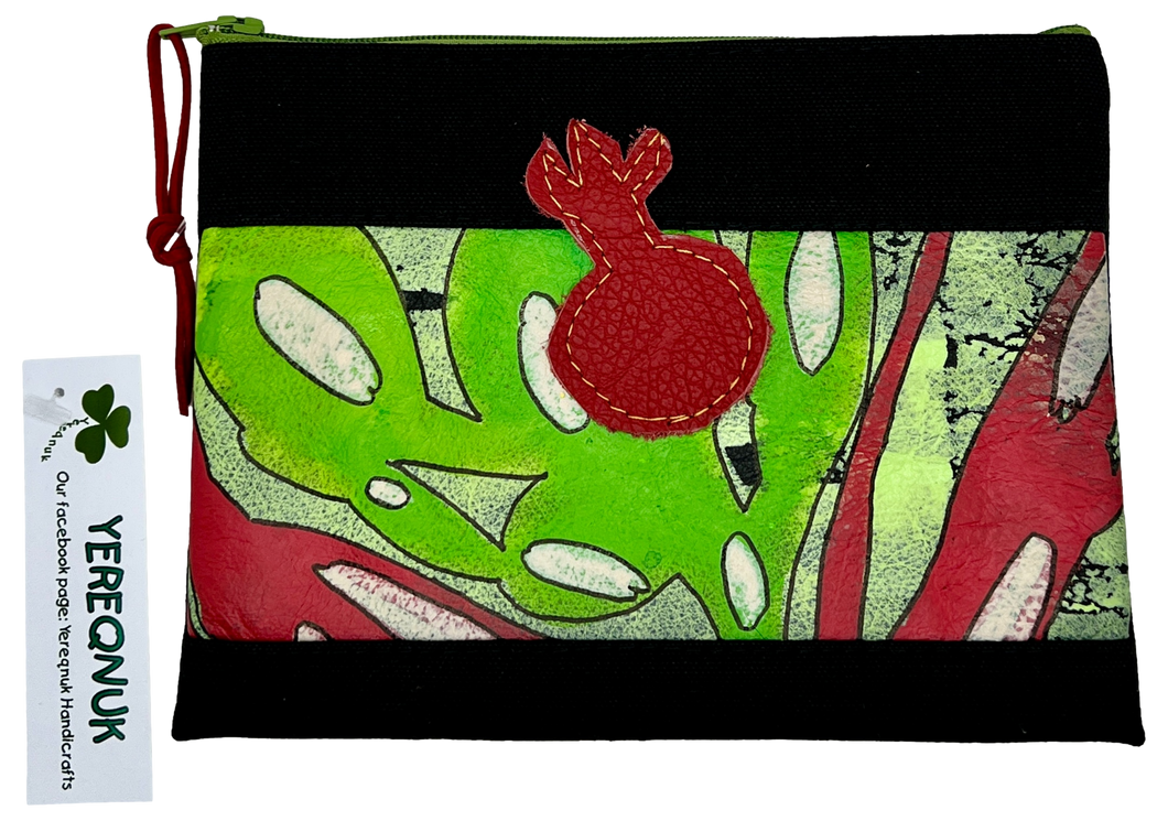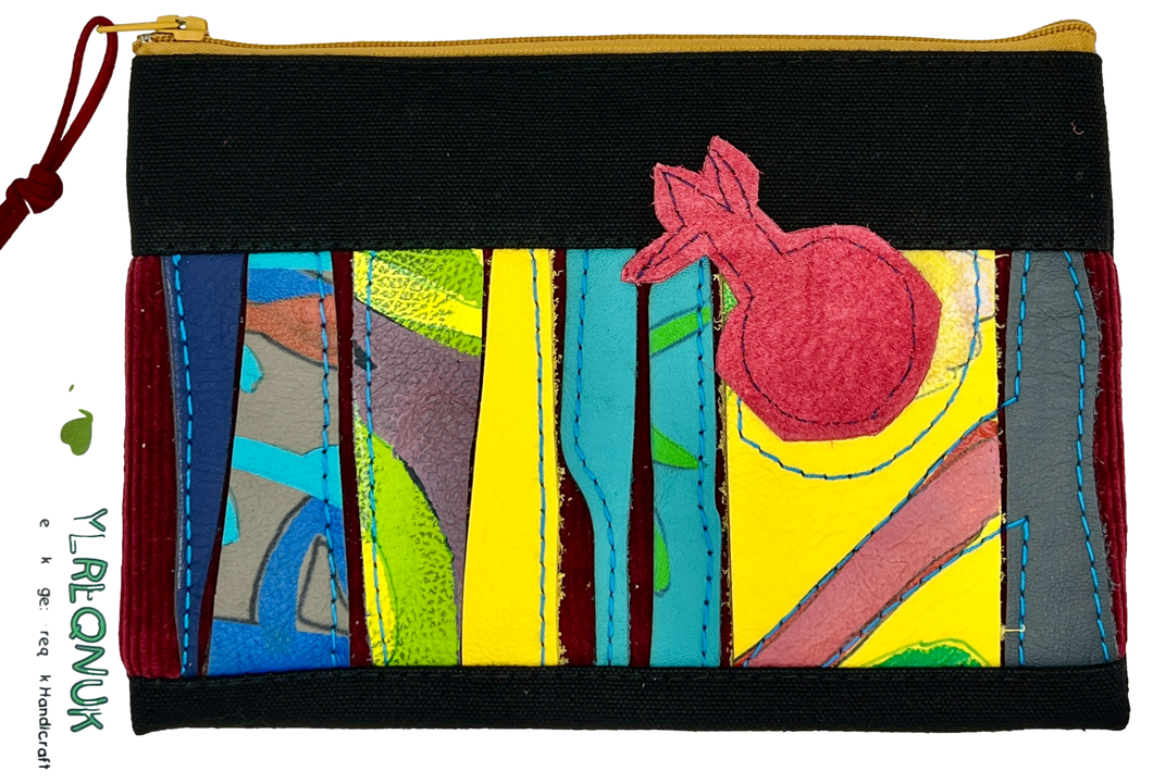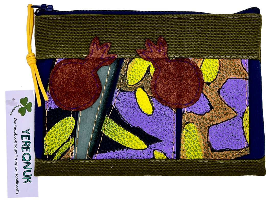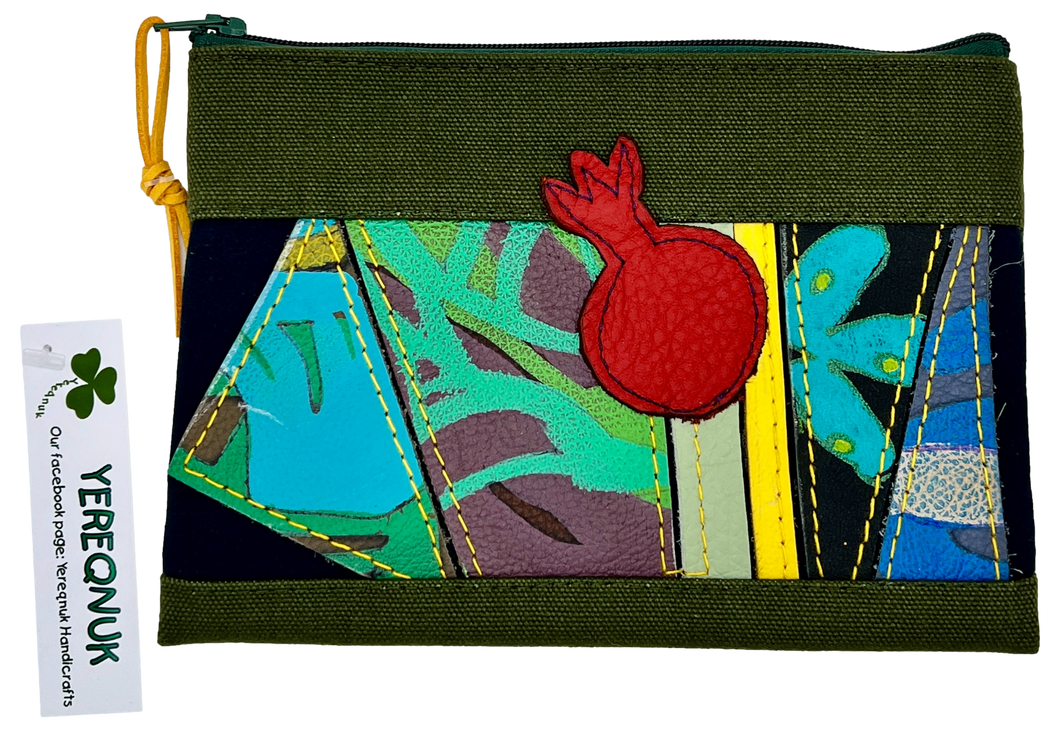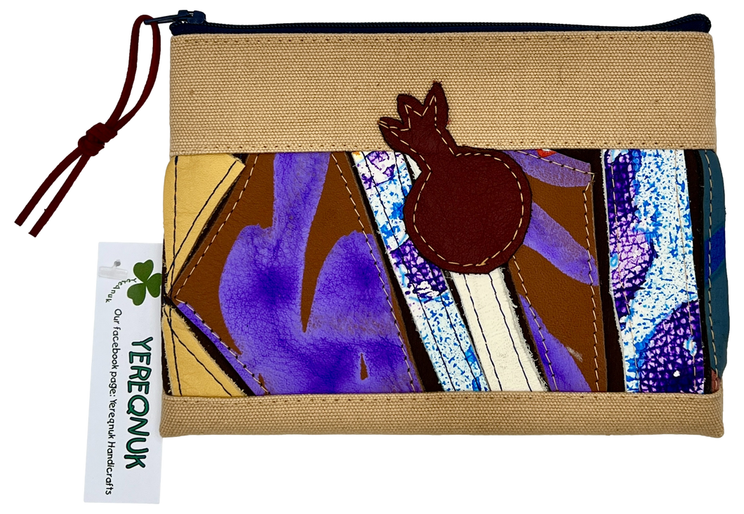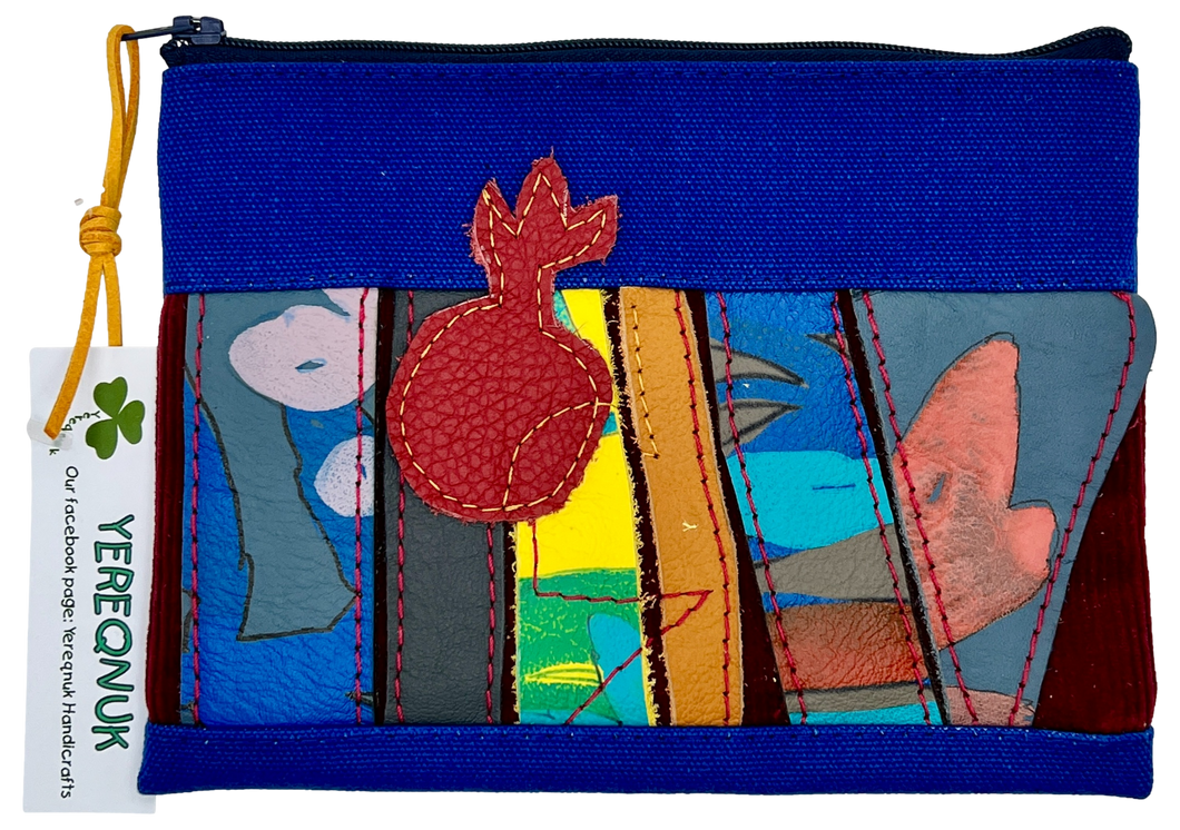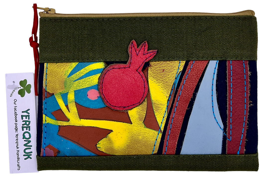 These colorfully hand-painted and expertly sewn leather and fabric cosmetic bags are the perfect addition to your makeup repertoire! Finely handcrafted by Koghb's Yereqnuk Atelier, each case is one-of-a-kind and only one of each is available. This unique product is made with hand-painted leather and sturdy fabric, with pomegranate appliqued embellishments. Secure zipper closure; fully lined. Copyright 2025 © Homeland Development Initiative Foundation.